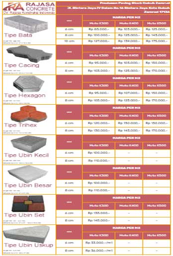 Untuk mendapatkan harga terbaik Paving Block/Conblock dan menghindari penipuan, disarankan untuk menghubungi Jasa Konstruksi Terbaik seperti RAJASA CONCRETE naungan dari CV. RAJASA KONSTRUKSI INDONESIA yang mana menjangkau keseluruhan Jabodetabek dan Keseluruhan Pesanan Indonesia sesuai kebutuhan bisa di konsultasikan terlebuh dahulu dan Segera infokan penempatanya. Layanan 24jam Siap dan Jujur Hanya di RAJASA CONCRETE.